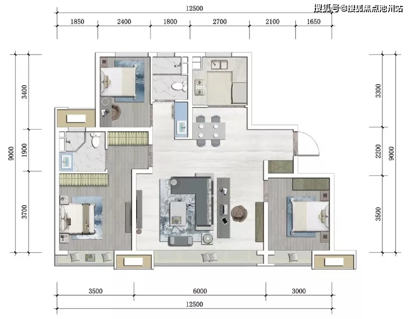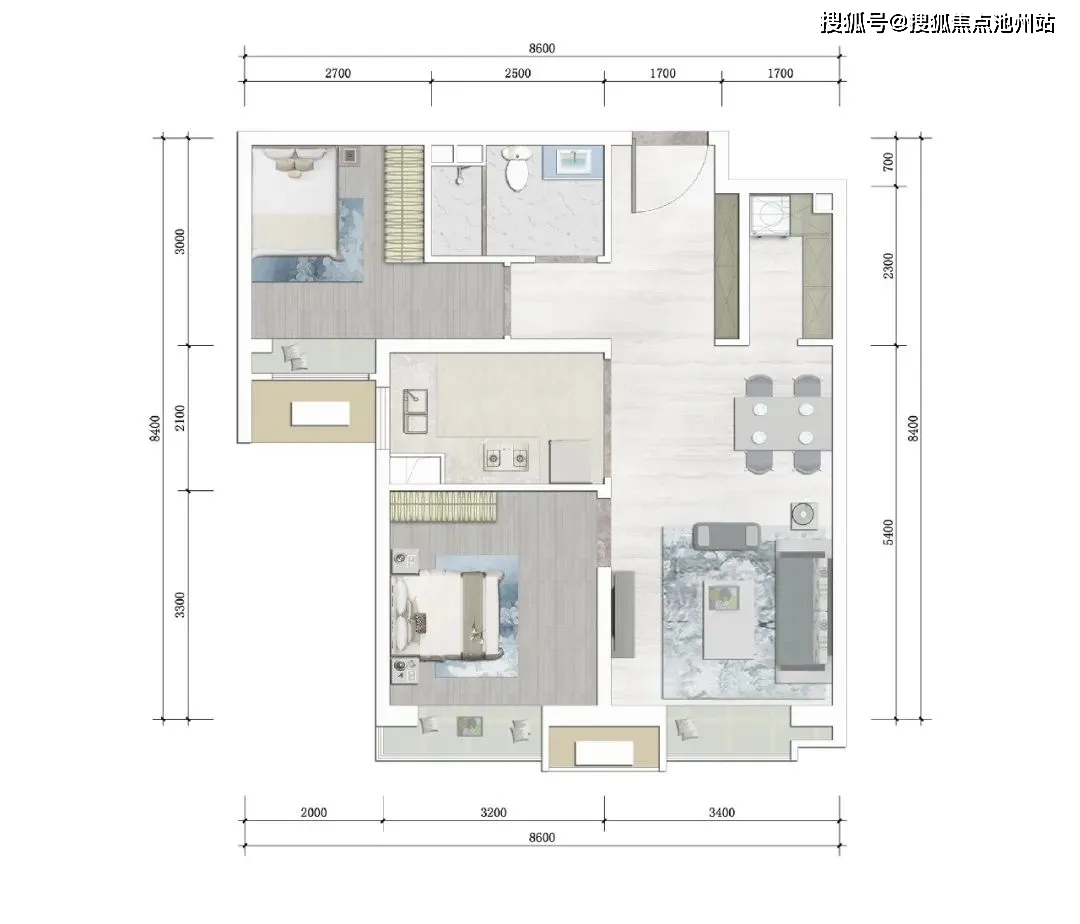 83㎡的小两居:户型比较方,正南向2.5面宽,两间卧室均有南向采光,餐客厨卫公共空间的一体化的规划,该户型还设置了独立的家政间。