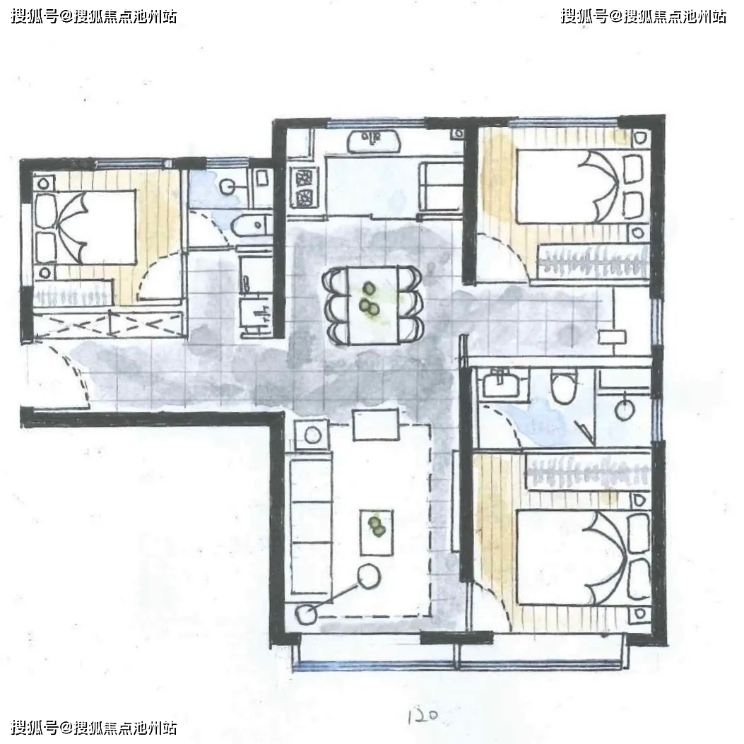 约120平米三居,南北通透3.5居室。除了三个卧室,还有一个多功能空间,可以作为书房等用途。双明卫设计,主卧套房,餐客厨一体化,这个户型比较适合刚改群体。