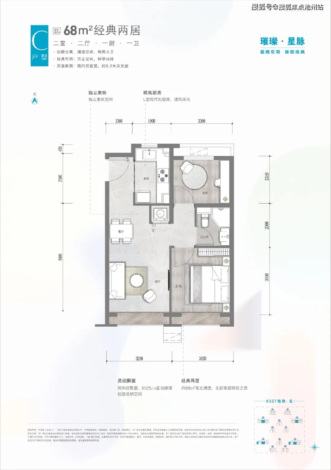 68平米两居室 南北向 :餐客厨一体化空间270°三面采光,南北两间卧室,南向飘窗、北向设备平台的规划,带来更高得房率。