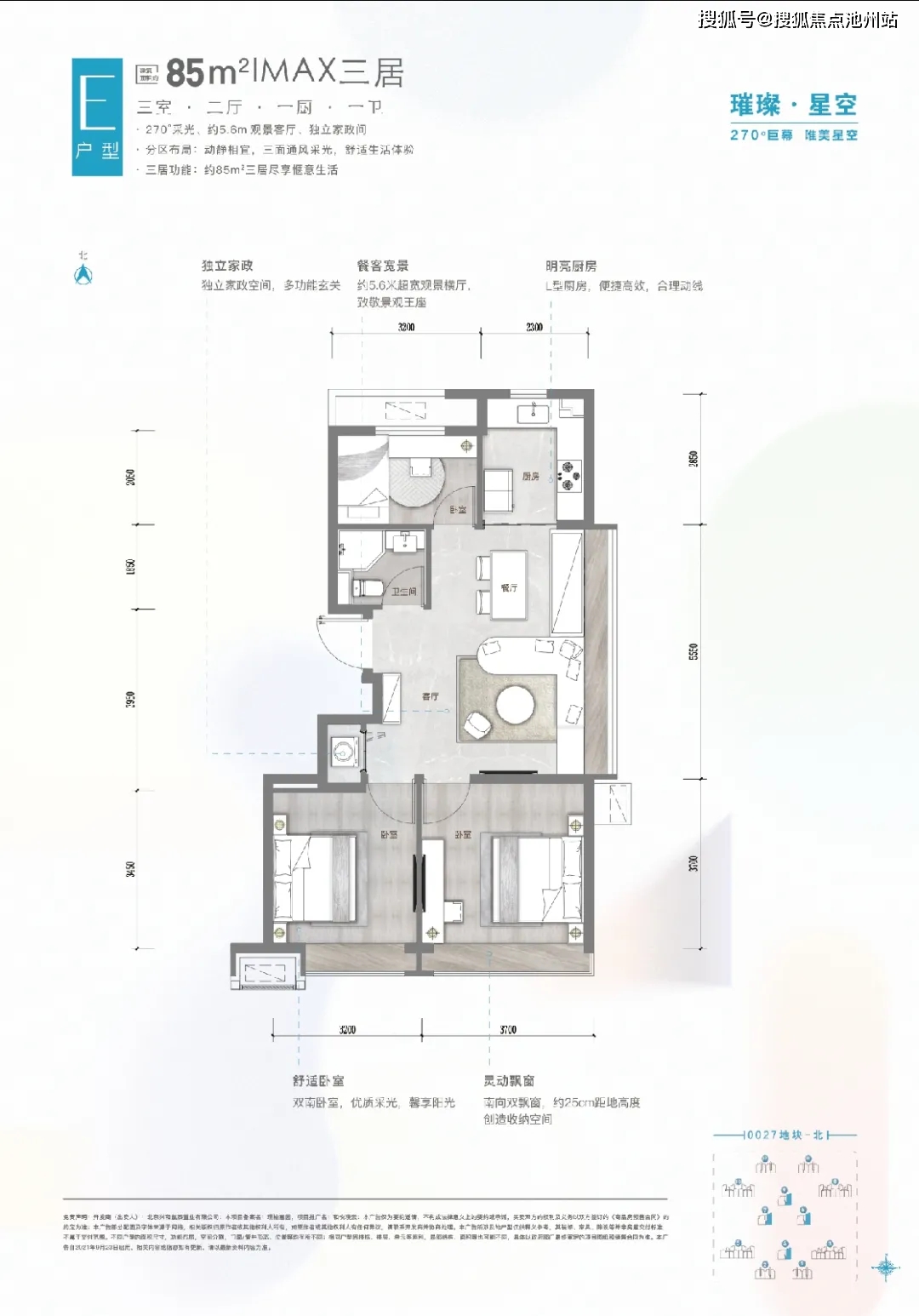 85平米三居室 南北向 :户型算得上紧凑,观景客厅,独立家政间,270°采光都是亮点,但因为居室多,面积有限,整体还是会有一些局促的感觉。