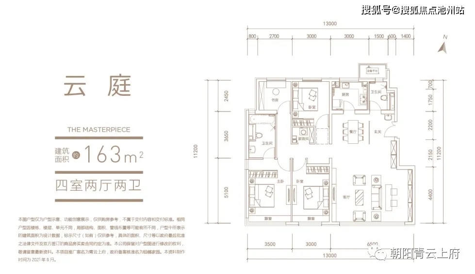青云上府主力户型为建面约163㎡四居室。整体设计思路是动静分离,保证个人私密和舒适度。双卫设计,全明空间,南北通透,户型整体基本面优质。南向面宽约13m,进深约11.2m,大面宽短进深,双卧+客厅朝南,客厅面宽约6.5米,餐客厅一体化。可根据需求将四居调整为三居,主卧面积可拓展至约40㎡,270°转角飘窗,搭配近50㎡的宽厅,奢享大尺度的舒居生活。