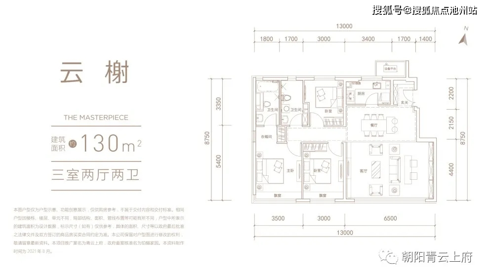 建面约130㎡三居户型为顶层退台,与四居户型大致结构类似,全明通透户型,动静分区格局,双卫设计。南侧面宽相同,三个南向面宽的尺寸也相同,同样是双卧+客厅朝南向,客厅面宽约6.5米。进深较四居户型短,采光视野优质。