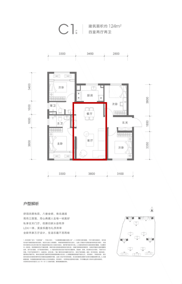 建面约124平户型,是长安悦玺的主力户型。这里来重点说一下。