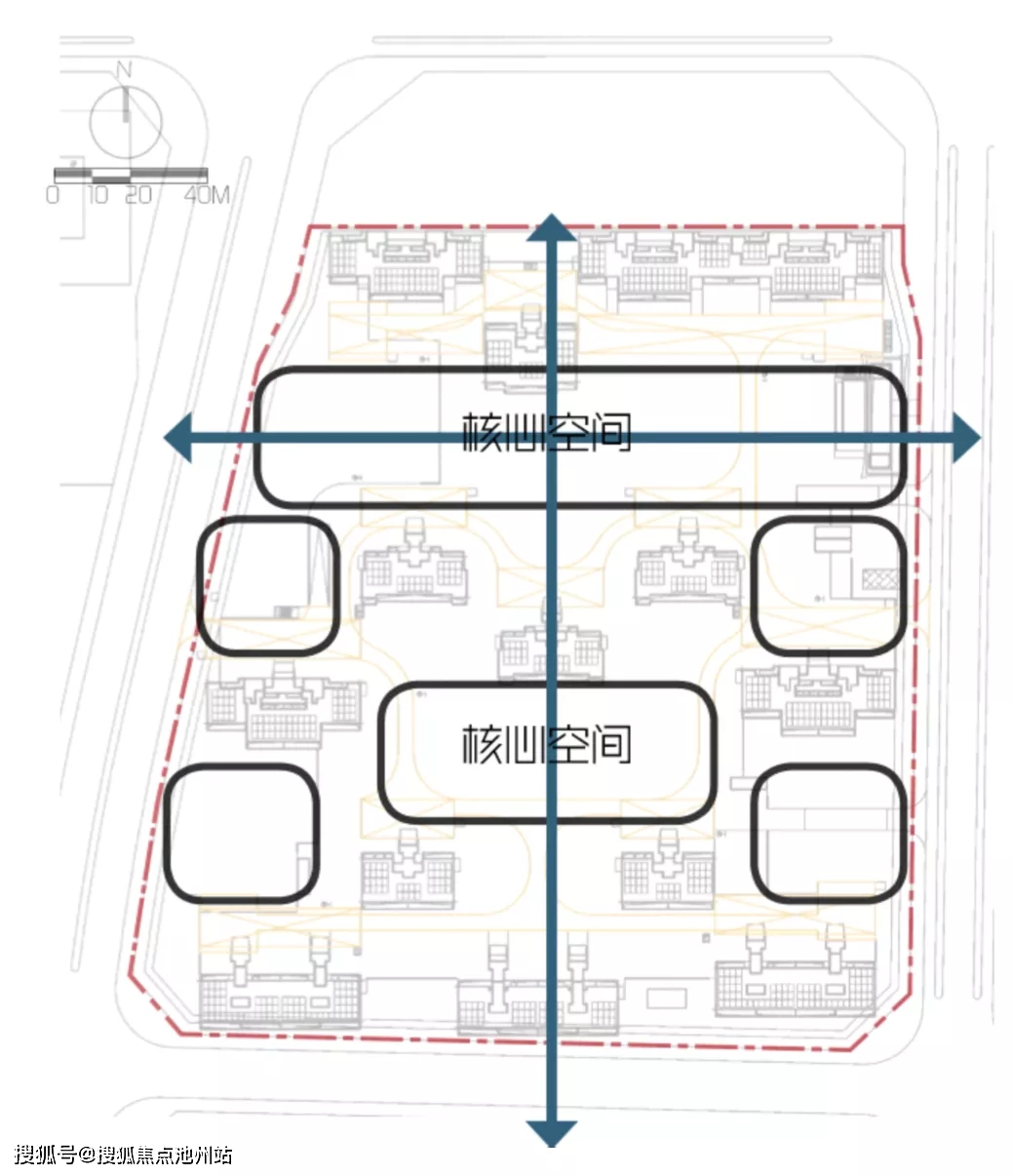 小区横轴空间狭长,纵轴空间尺度宽广,横纵两轴的空间打造,让小区形成了既有多重轴线体验空间,又有景观亮点的独特设计。