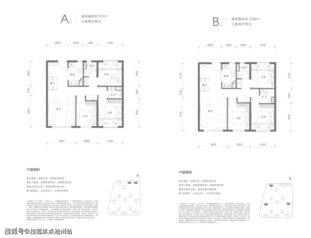 建面约104平米的三居,格局是97平户型的放大版,尺度更宽阔。