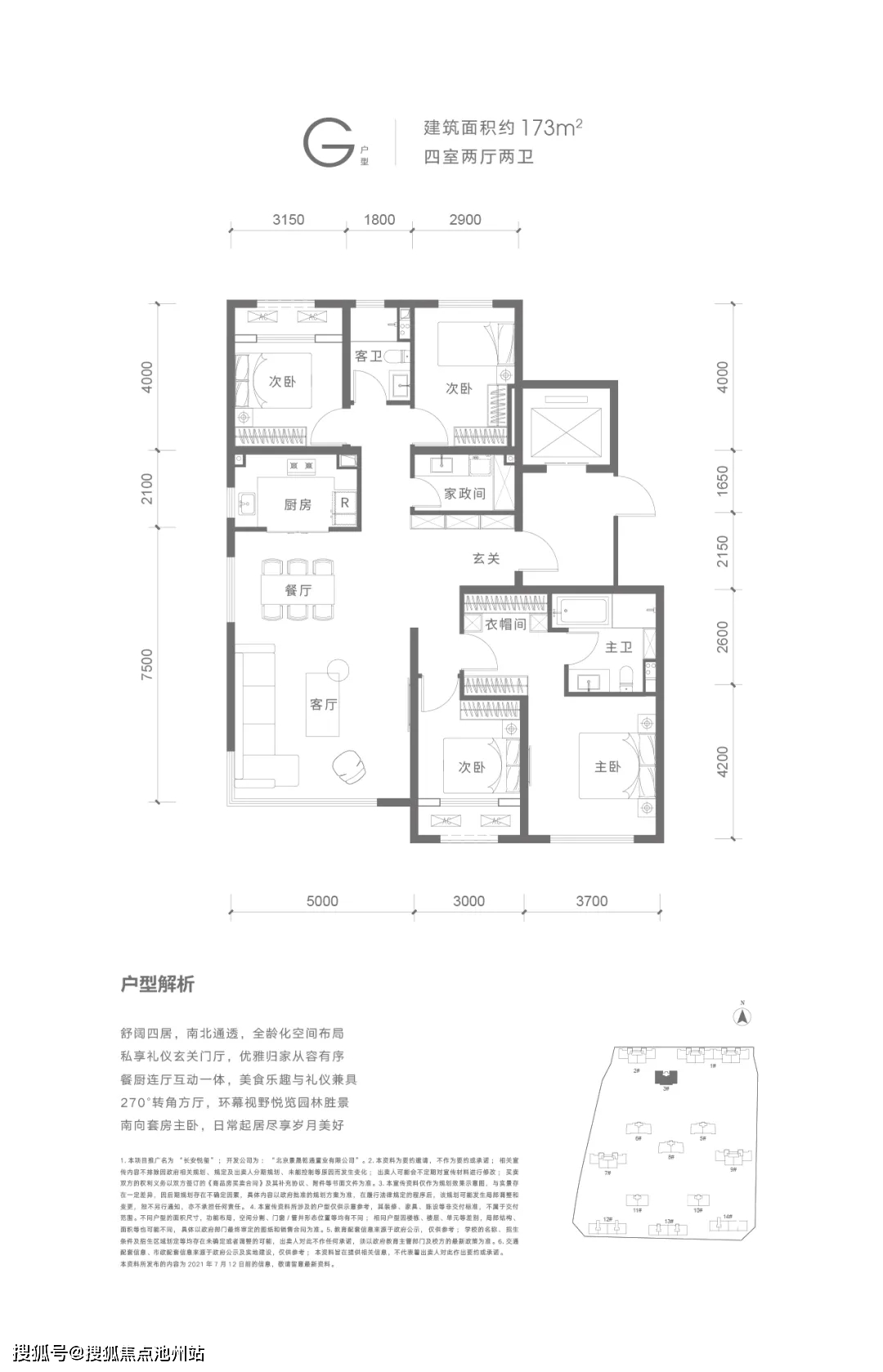 建面约173平户型,处于楼王的位置,是长安悦玺较大的户型。270°转角边厅,客餐厨连体,餐厅也有明亮的大窗,能享受到较好的采光,是小区园林较佳观赏点。