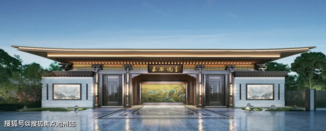 大门依然参考了王府大门形制,在古代大门中规格较高,高近7米,宽度近30米,两侧的石材拼接艺术,将山水收纳其中,颇有种千里江山尽在于此的意境。