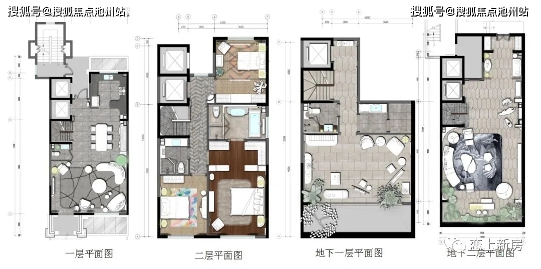 ❈四层叠拼,上叠面积约在280-310㎡北向花园,下叠面积在365-410㎡南向花园。户型方正,客厅面宽7.4米,两层地下空间采光井配合挑空明亮实用。