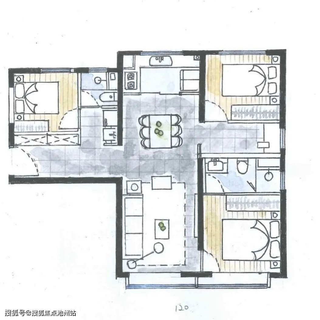 约120平米三居,南北通透3.5居室。除了三个卧室,还有一个多功能空间,可以作为书房等用途。双明卫设计,主卧套房,餐客厨一体化,这个户型比较适合刚改群体。
