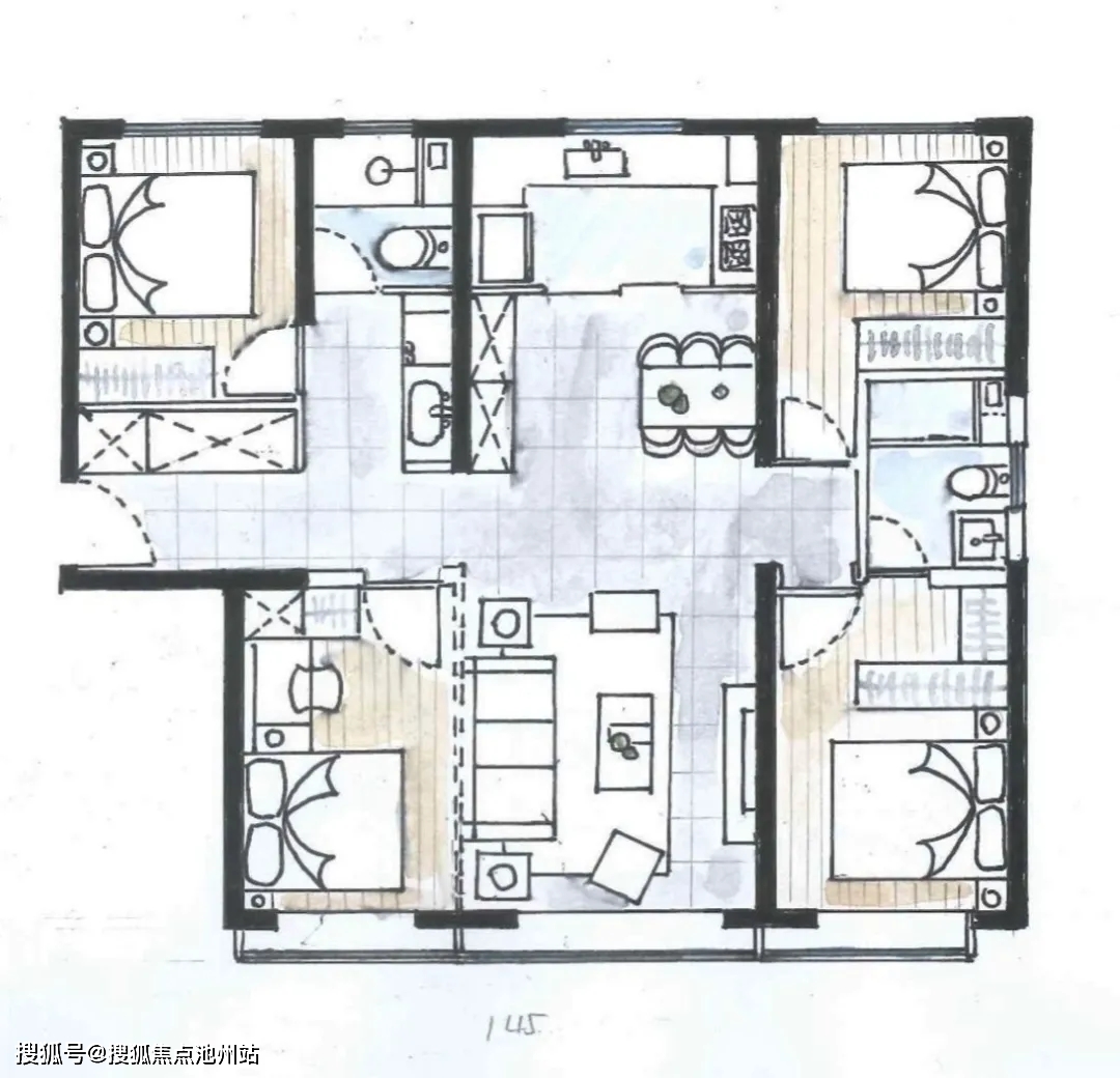 约145平米四居,是绿城沁园较大的一个户型。南北通透,三面宽朝南,四叶草布局,四个卧室互不干扰,私密性很好。这个户型主要在3#,位于小区的最北侧,具有小区较大的楼间距和较佳的观景视野。