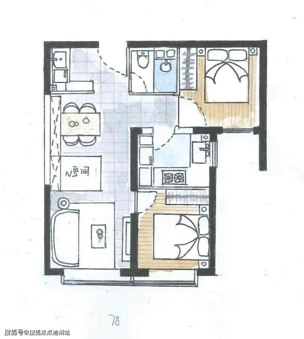 约78平米(有可能是80平)两居,纯南向和纯东向都有。纯南户型分布在8#9#10#三栋楼,纯东户型分布在1#5#。这个户型格局比较方正,总价不高,两个卧室比一居更实用,适合刚需上车。