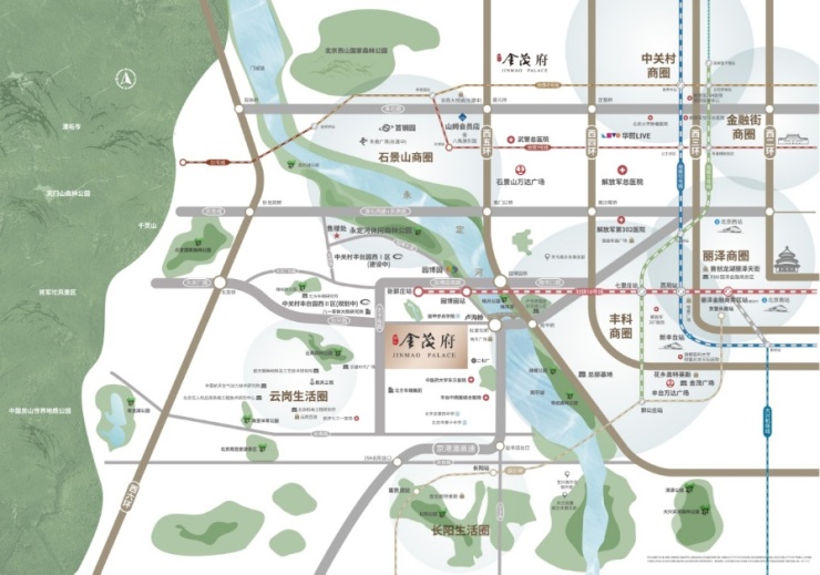 西山金茂府所处区域整体绿化率高达约50%。坐拥一河五湖八园,构筑北京难得一见的生态宜居之地。一河: 永定河;