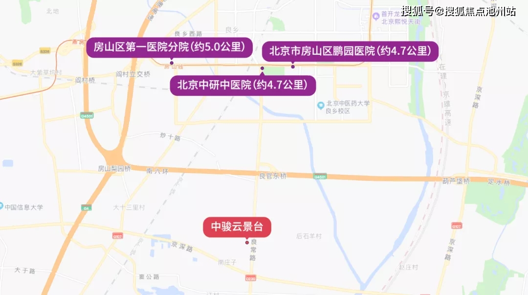 3个综合医院:北京中研中医院(约4.7公里)、北京市房山区鹏园医院(约4.7公里)、房山区排名前列医院分院(约5.0公里)。