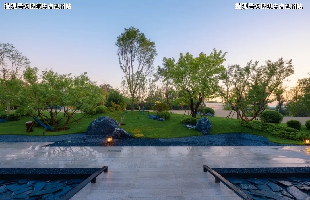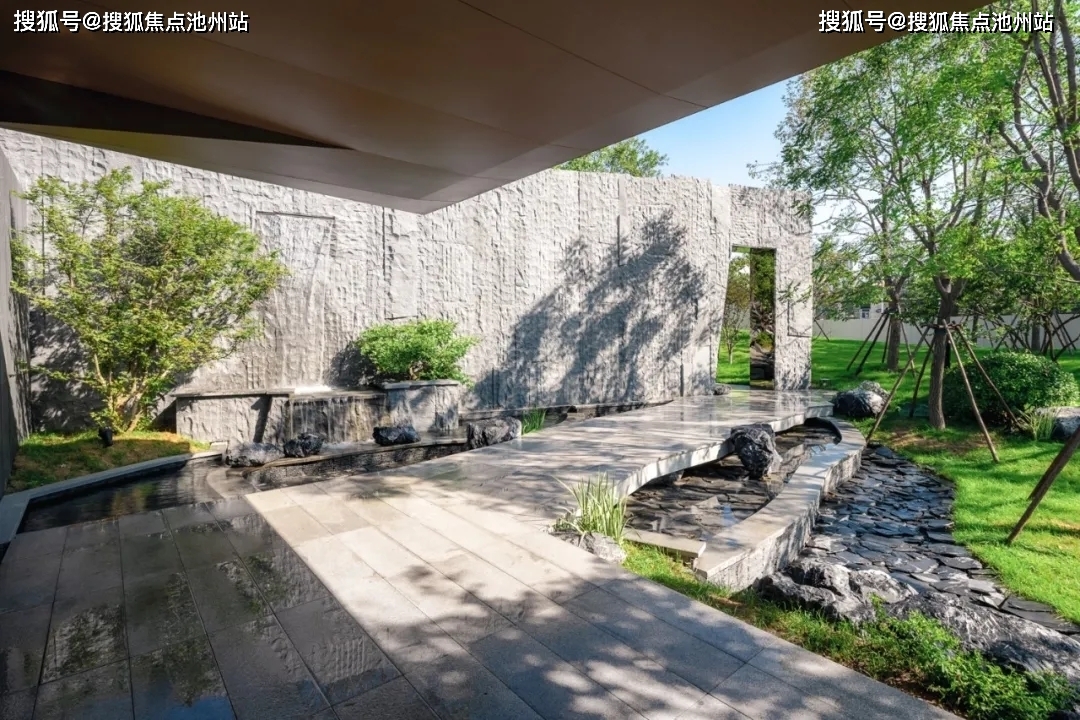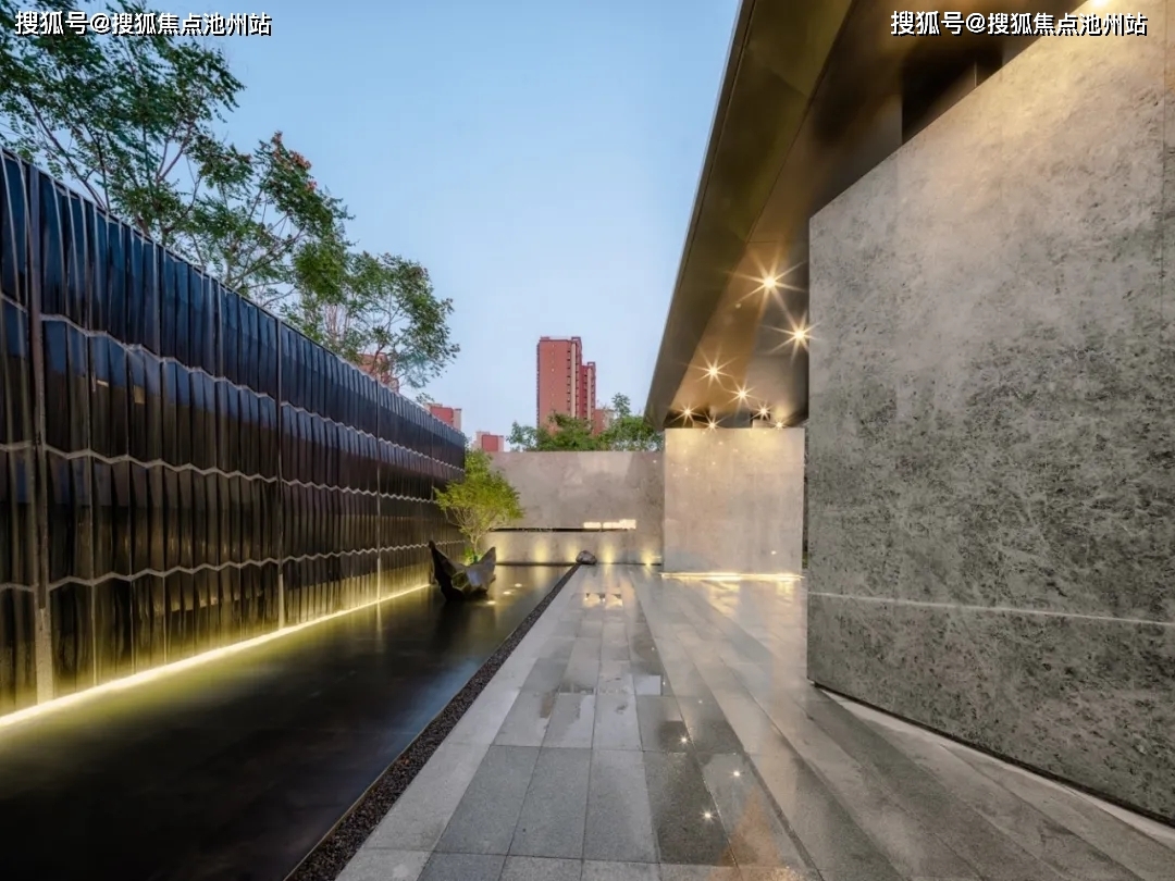 迎宾排名前列印象的影壁,通过深色石材的东方符号式切割与矩阵式重复切题西山,下置舟形雅韵雕塑营造东方山水意境。