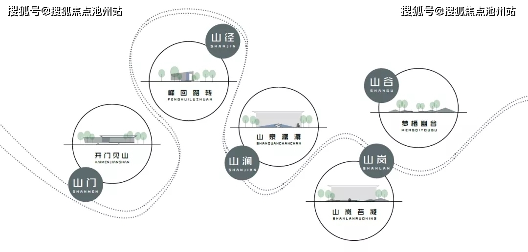 山径山溪山居,充分利用了原状空间的竖向高差,从进入示范区后营造了一场山间居游,由低到高,步步抬升,使观者充分沉浸于自然。