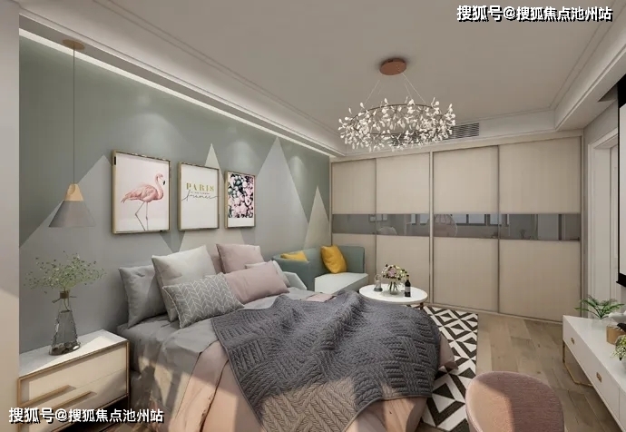 以粉色、浅墨绿色、灰蓝色等色系相组合,呈现温馨舒适的少女卧室,业主不经常做饭,所以将厨房做成开放式的,从而在视觉上扩大空间,浴室则是选用浅灰色装扮,不仅增加了视觉上的开阔,还很大气。
