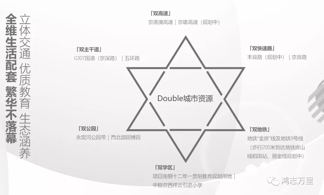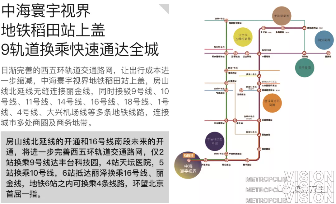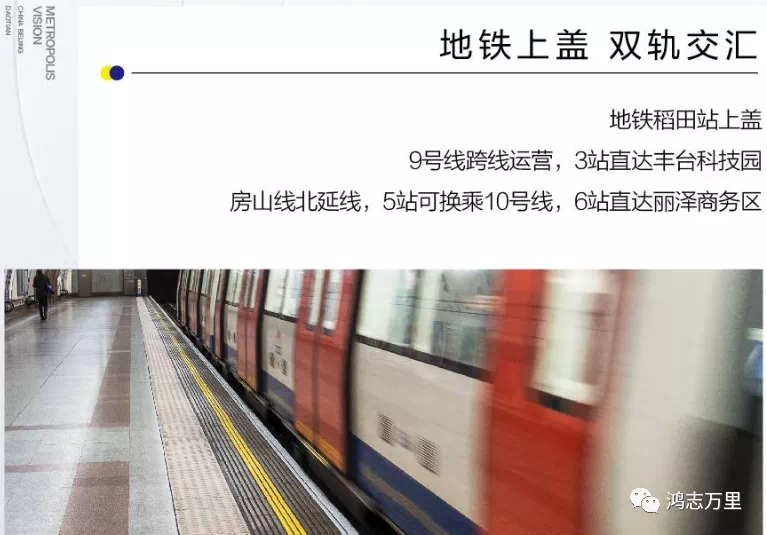 【双地铁】地铁“金房”线及地铁9号线(步行200米到达地铁房山线稻田站、丽金线规划中)通过金房线可直达:总部基地商圈(10分钟)、丽泽商圈(25分钟)、金融街商圈(40分钟);可连接1号线、4号线、6号线、7号线通过9号线可直达:总部基地商圈、北京西站(30分钟)、军博-长安街(35分钟)通过金房线一站换乘可连接:1号线(金融街)、4号线(中关村)、6号线(西直门、通州)、7号线(北京西站、菜市口、双井、通州)、10号线(国贸)、14号线(望京)、16号线(西苑)、新机场线(丽泽、草桥、大兴新机场)【双高速】京港澳高速、京雄高速(规划中)【双学校】项目南侧一路之隔的十二年一贯制教育规划用地,九年一贯制大宁学校【双重发展战略】国家战略京雄发展走廊、北京市战略“一轴两带”的两带之一“西山永定河文化带”【双会所】景观会所、运动会所