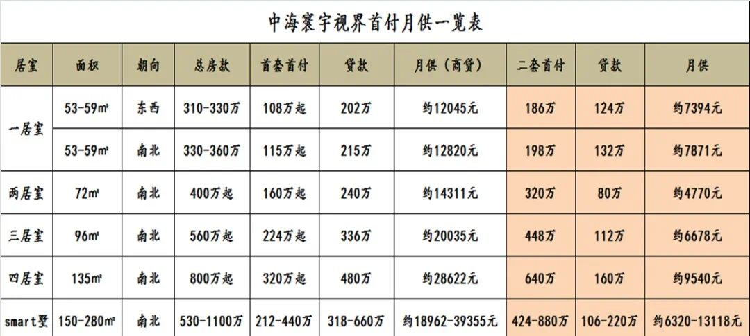 一室一厅一卫 53/59㎡:310万起 分布7# 14# 15#两室一厅一卫 72㎡:400万起 分布1# 4# 5# 6# 11#三室两厅两卫 96㎡:560万起 分布8# 9# 10#四室两厅两卫 135㎡:800万起 分布2# 3# 12# 13#smart墅 150-280㎡:530-1000万起 分布所有楼栋1层,共70套