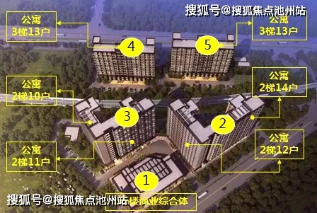 规划共5栋楼,1号楼为商业综合体,2-5号楼为酒店式公寓。2、3号楼总高16层,2号楼东南面为2梯14户,西南面为2梯12户,3号楼东南面2梯11户,西南面2梯10户;4、5号楼总高12层,设计为3梯13户,共计1069户。