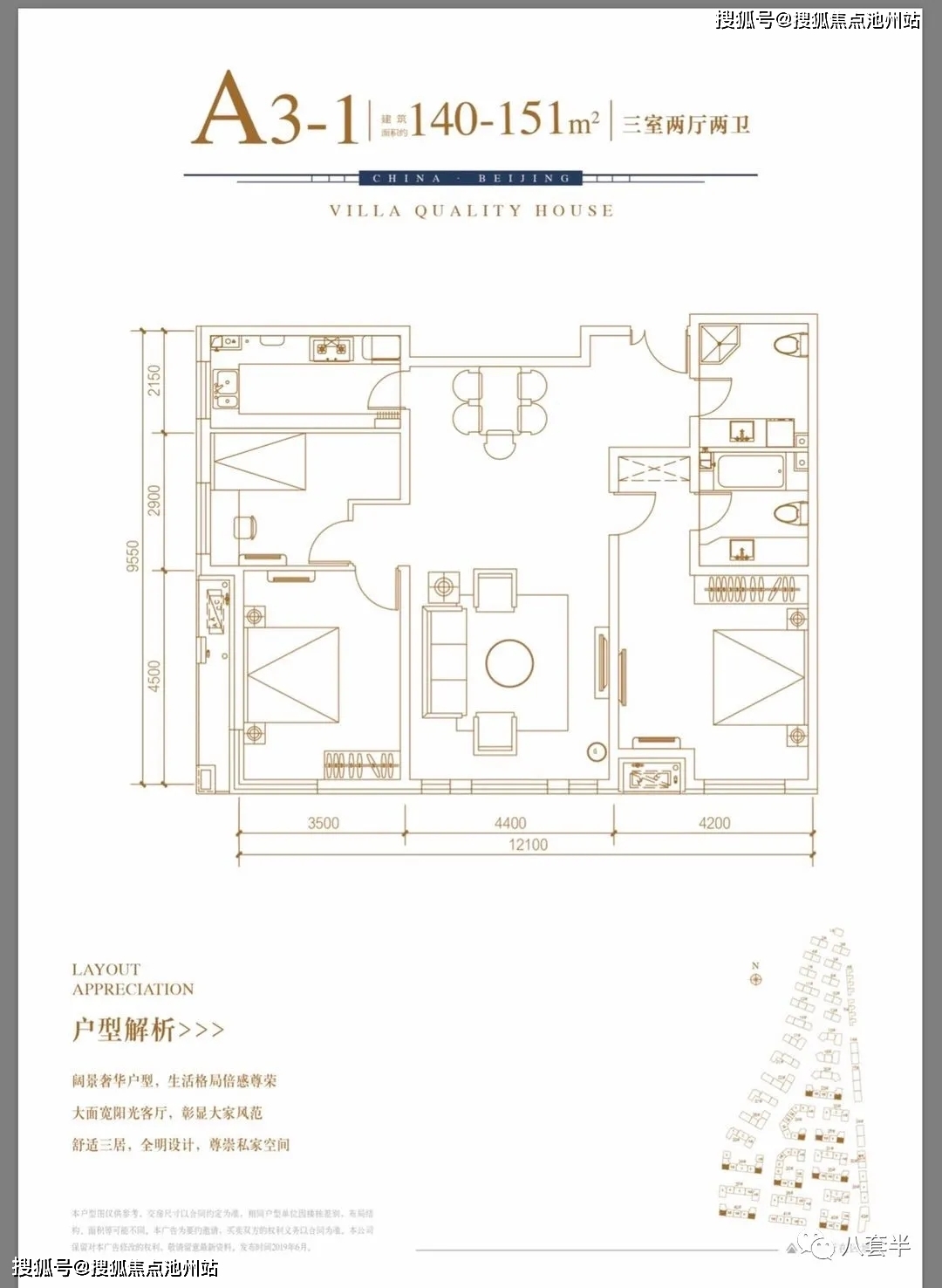 A3户型三居室:142平米到151平米(户型为东南西朝向)