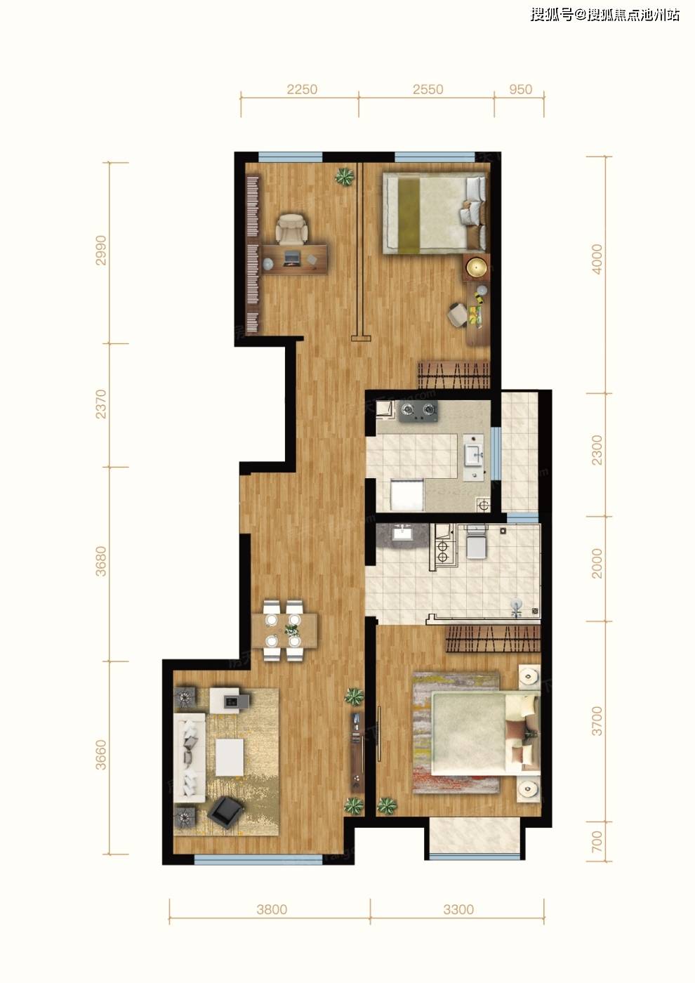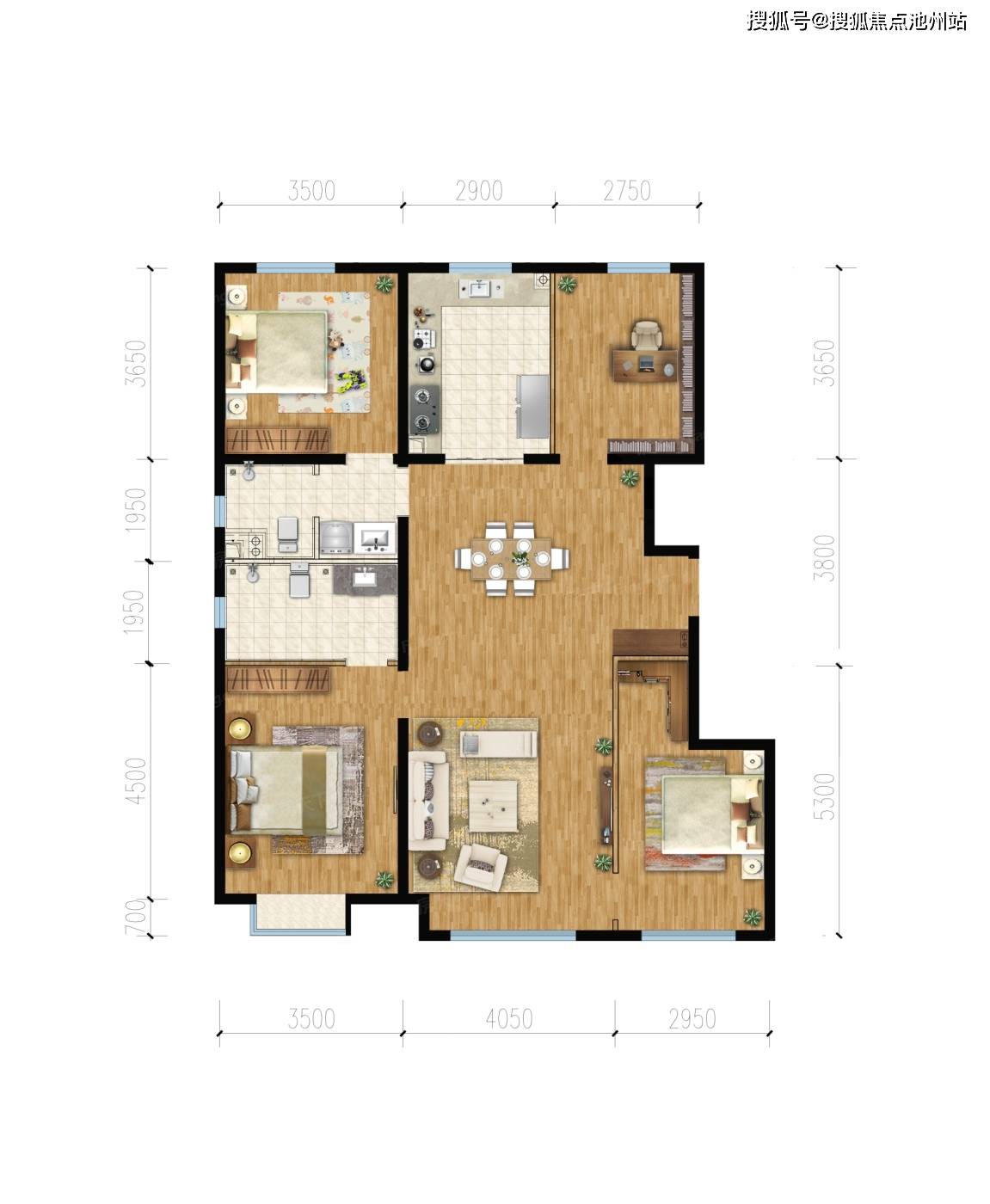 147平四居室户型方方正正,双卫都是明卫,保证通风,三面朝南,面宽10.5米,采光充足,L型厨房操作空间宽敞,每个卧室隔开坐落在户型的四个角上,保证每个人都拥有自己的私人空间。比较适合二胎家庭等人口较多的家庭购买。