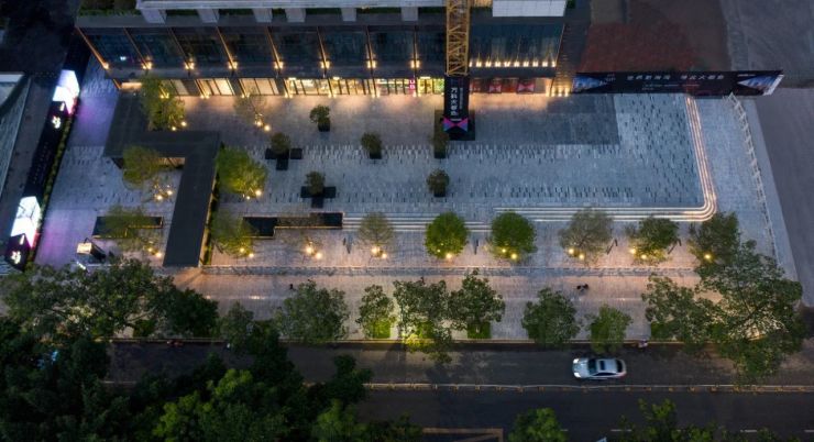 展示区首层的景观包含了五号地(宗号A007-0569)商业广场的一部分,主要以灵活多功能的商业广场为主,配以可移动树池及座椅,打造广场林荫大道下休憩空间的同时也满足了消防通道的需求。同时,为满足项目施工过程中安全规范要求,首层也临时搭建了一个与整体设计语言呼应的风雨连廊。