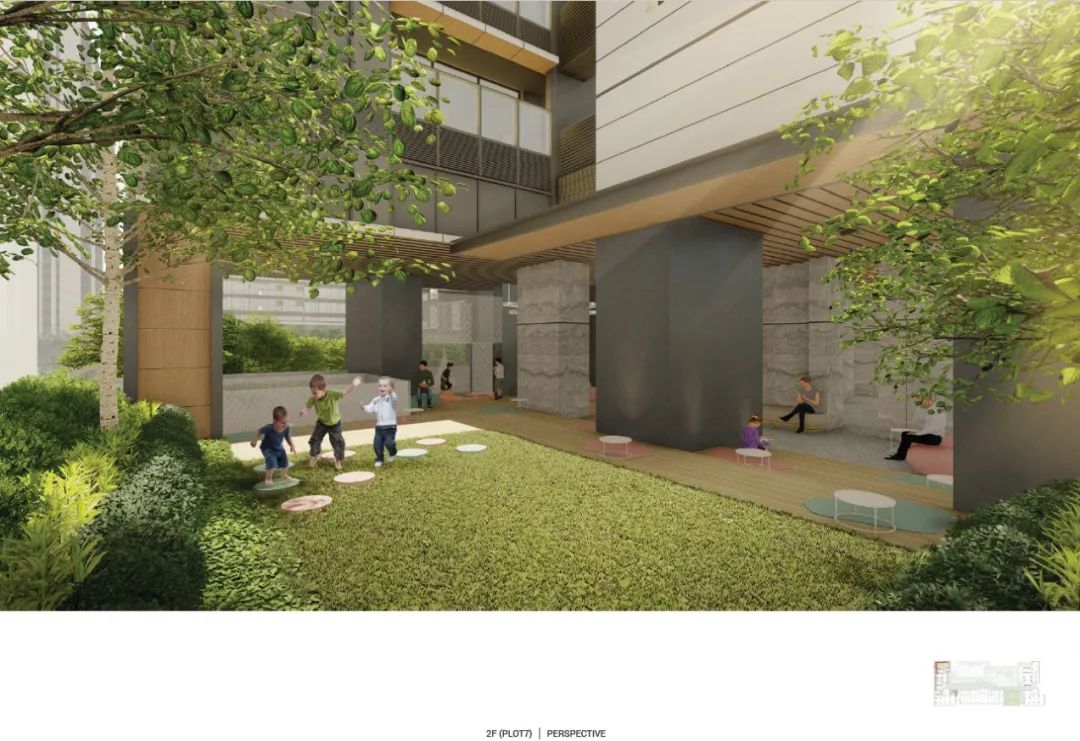 Landscape on the ground floor at the sales gallery part mainly includes a small part of the commercial plaza. Moveable planter and seating with co-living activity space are integrated at this area. For sales gallery, a covered walkway for safety issued is also installed to enter thelobby of sales gallery.