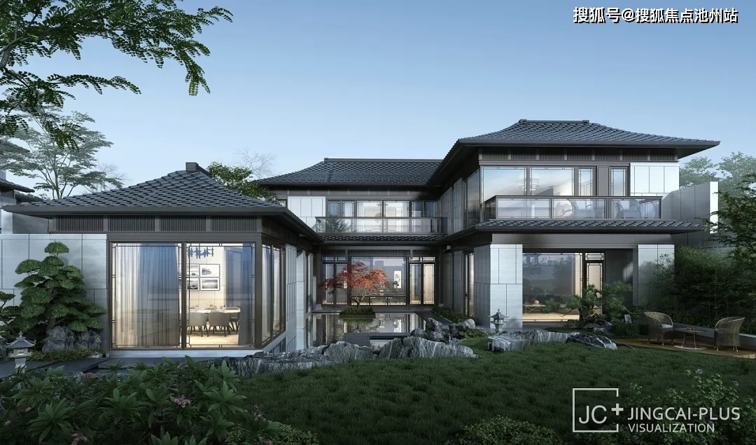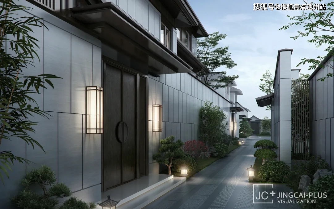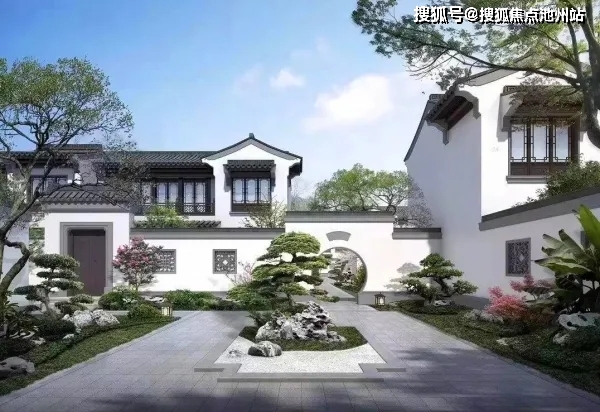 新中式建筑总体而言可以归纳为两大派系: 北方的合院派和南方的园林派。整体建筑形象可用“粉墙黛瓦”来形容,如同中国水墨画,淡丽清雅,诗意油然而生! 北方的合院派建筑在外观上采用了北京四合院的灰色坡屋顶、筒子瓦及一定高度的墙院围合方式;材质上多选用地域色彩浓厚的灰砖,形成雄浑、宏大的气势;空间结构上则是尽可能多地设计庭院空间,以追求四合院的全包围形式。