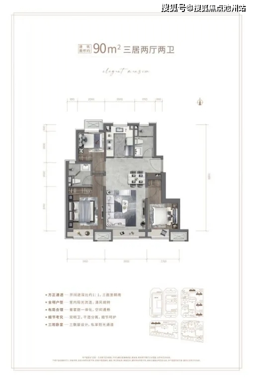 客厅、双卧三面朝南,客厅面宽达到3.8米,大尺度窗形成超大采光面。