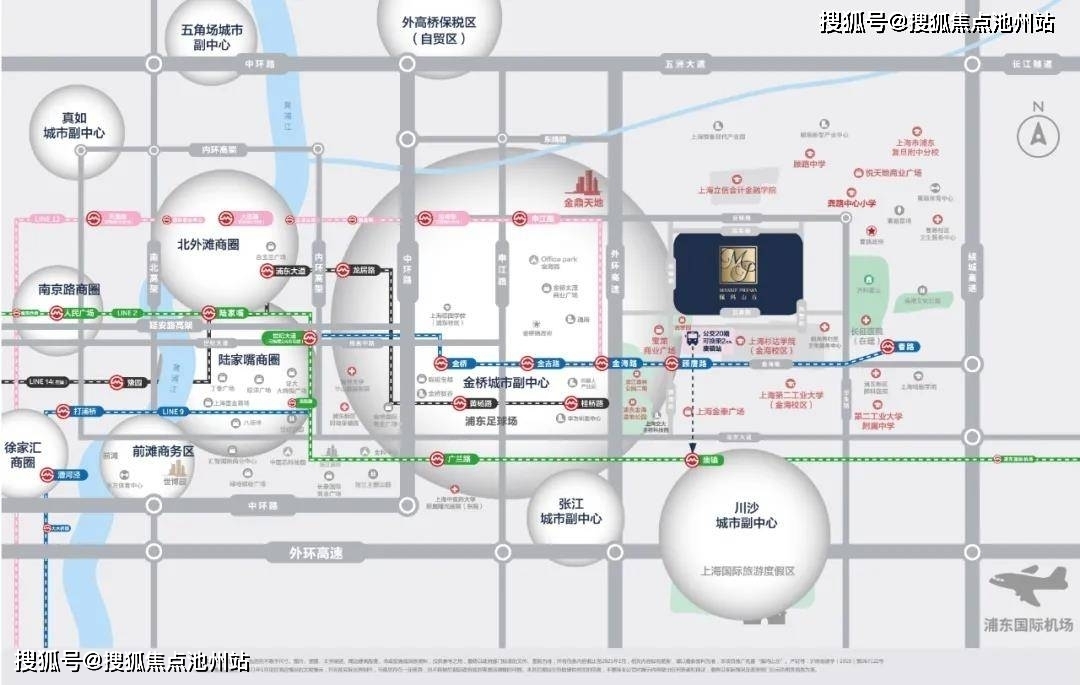 本项目位于浦东新区金桥开发区以东,川沙城市副中心以北的核心区域,地处外环旁直线距离1.4公里,紧邻金桥版“九宫格”的商办核心区3.5公里,距离金桥城市副中心约6.5公里(金湘路),距离陆家嘴金融CBD约17公里。