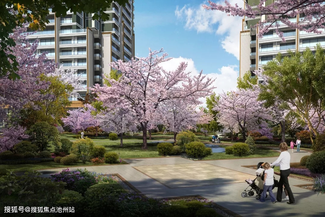 打造了约13000㎡的新古典主义园林,中轴线上分布有礼宾大堂、中央水景、下沉式庭院,据说全冠移植了近100株日本原生樱花林。