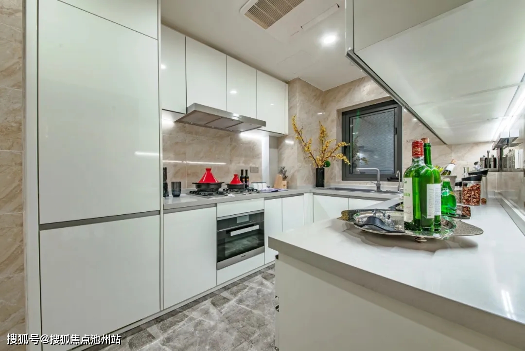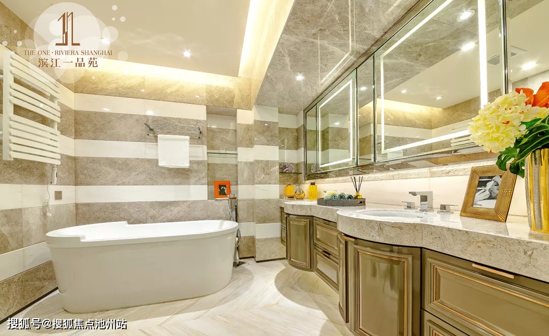 项目前期厨房配置了铂浪高的水槽及龙头、柏丽橱柜及爱适易垃圾处理器、怡口户式中央净软水;卫浴系统选用了德立菲的卫浴、高仪龙头、卡迪欧电热毛巾架。