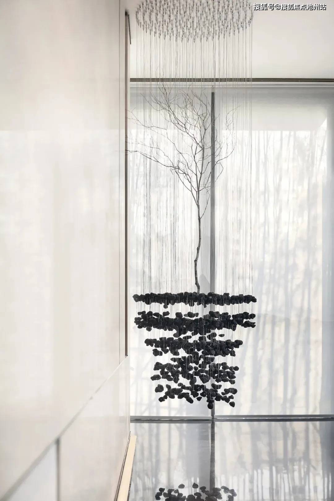 入口设置大型原创艺术品,半透的金属网,增强了庭院的景深,也展现了水乡朦胧美的意境,虚实结合。设计提炼乌镇古建筑窗格的元素,融于墙面,形成独特文化元素。石与木的对话,细腻与粗糙的对比,彰显了品质与自然亲近感。