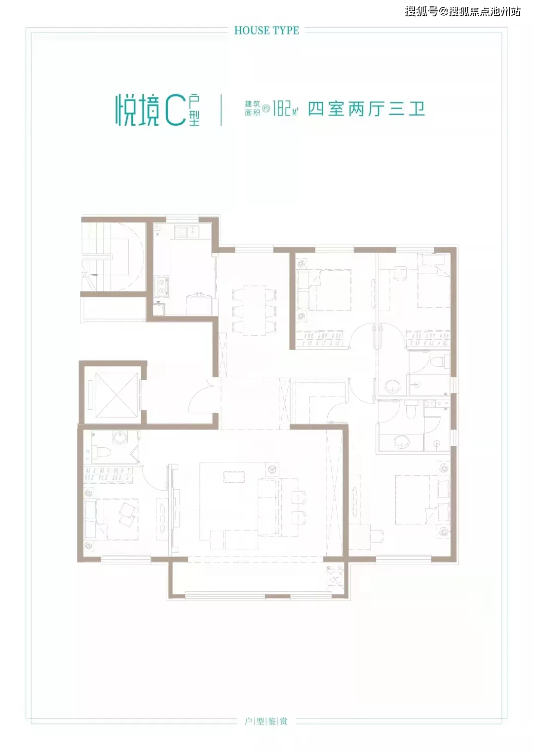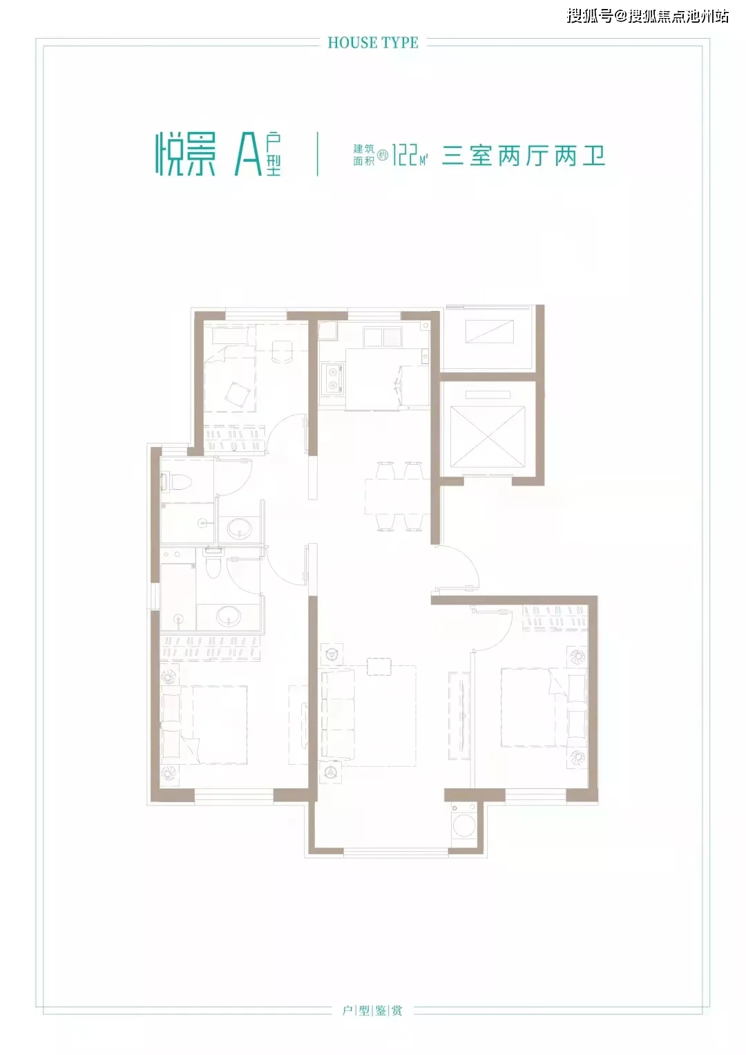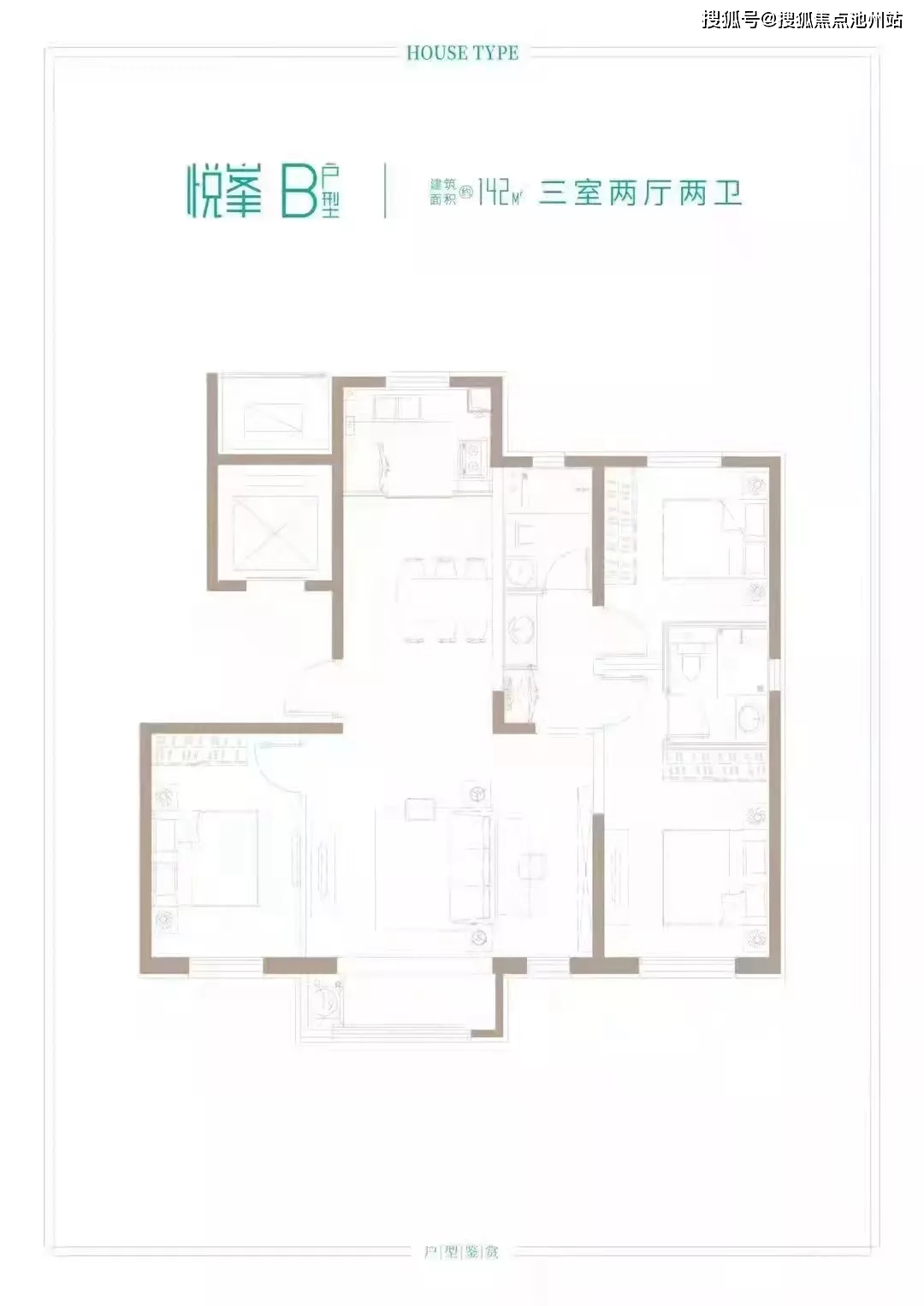 中绿.东岳府全部为改善产品设计,面积为122平、132平、182平三居或四居,户型全部都方方正正,三面宽设计,南北通透,明厨明卫,客厅带阳台。