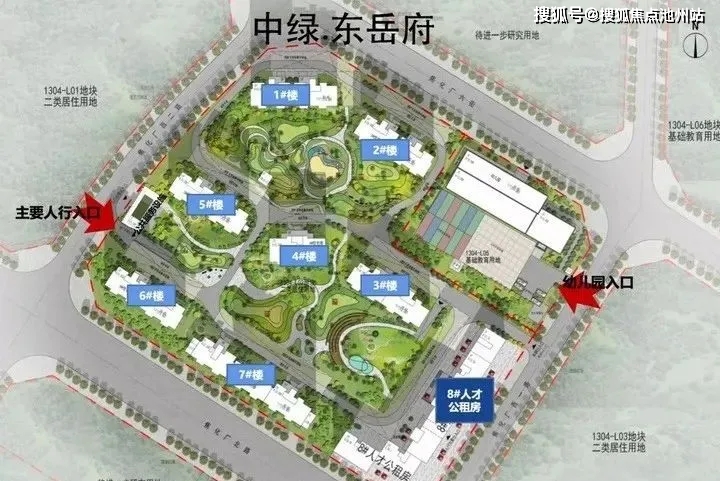 中绿.东岳府共8栋7-18层的高板和1栋3F的幼儿园(东北角)组成,其中东南角1栋8号楼是人才公租房。