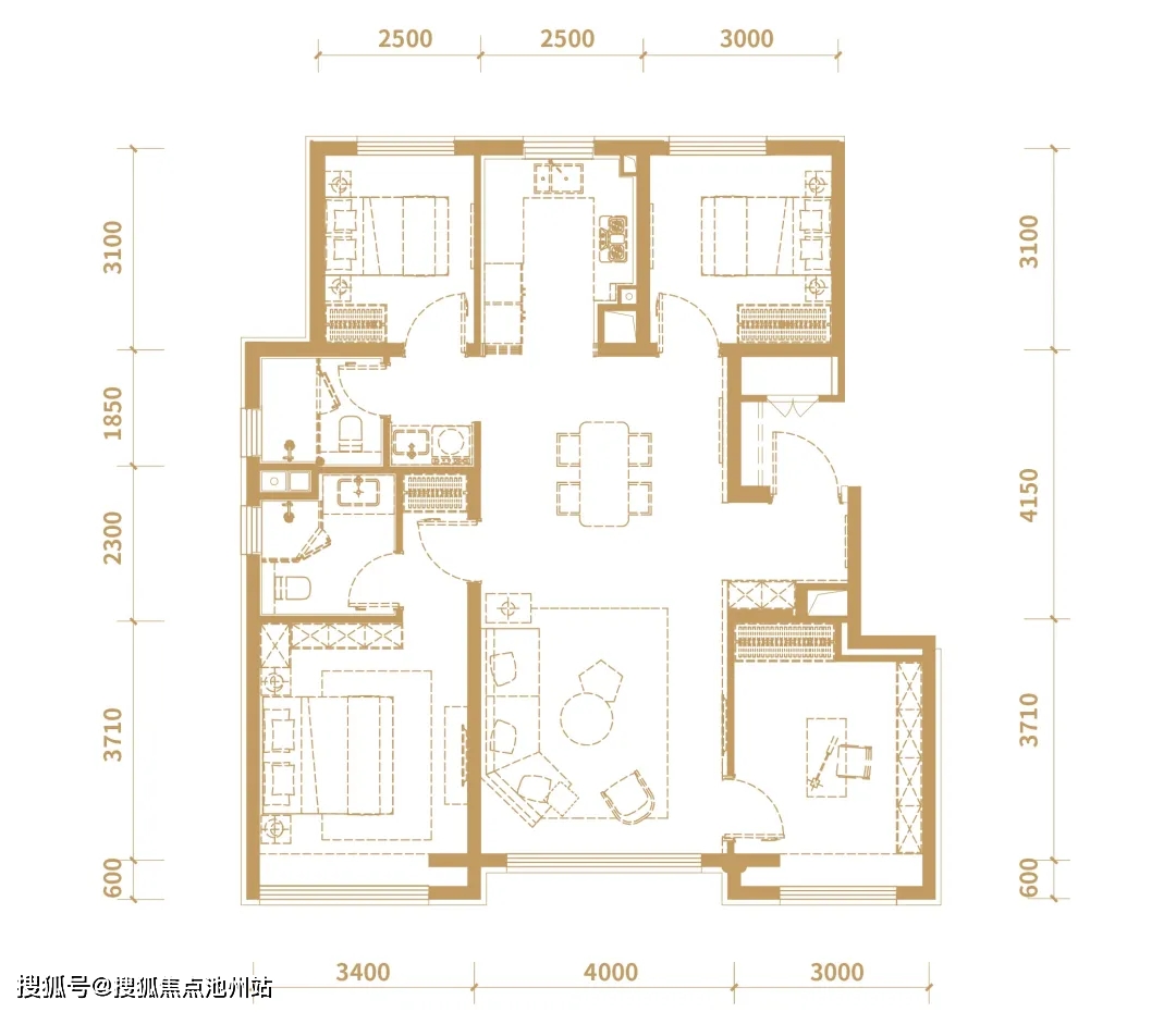 两个卫生间都是明卫,全屋南向三面宽约10.4米,有很好的采光和通透性。户型亮点非常多,这个面积段做到这样的四居格局非常难得~
