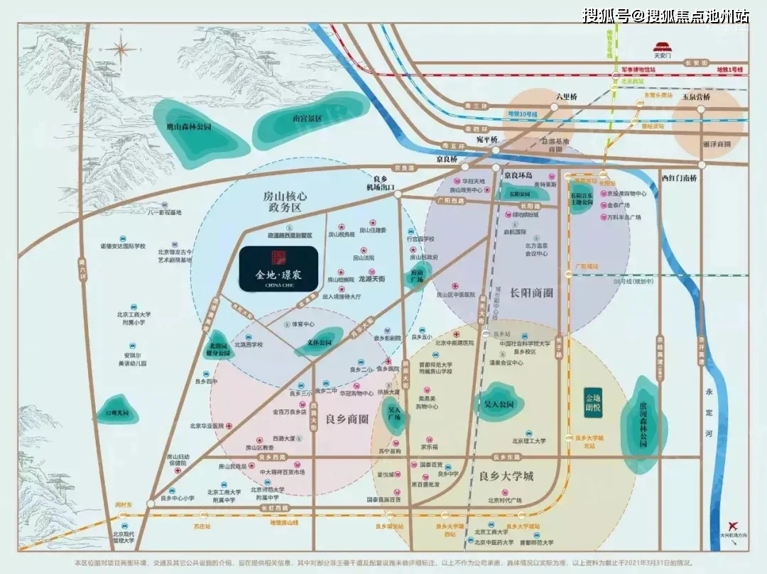 拱辰街道是房山区政府所在地,金地·璟宸东南侧800米就是房山区政府,项目与龙湖天街相距600米,出门上京港澳高速也很方便。美中不足是,项目距离最近的地铁房山线良乡南关站直线距离都要2.2公里。
