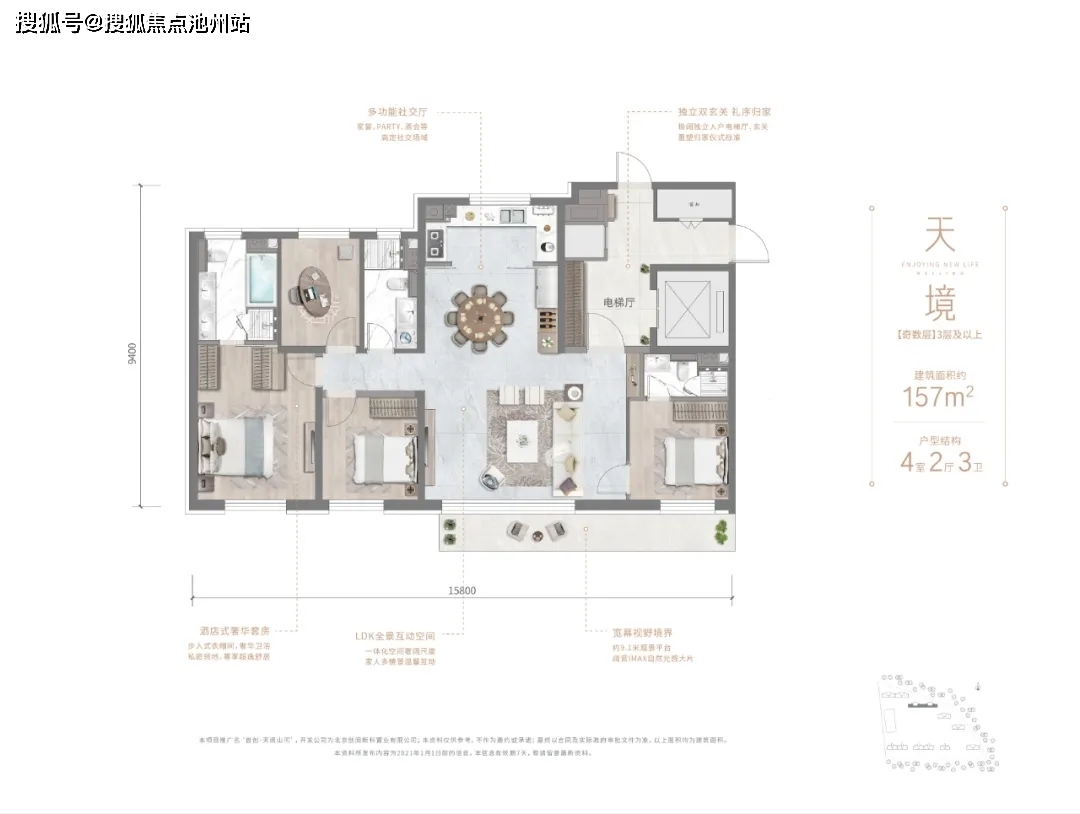以157㎡户型为例,南向面宽长达15.8米,客厅面宽最多可以做到9.1米,这样的奢阔尺度在首创·天阅山河这样的大平层产品中出现,是非常难得的。该户型拥有一梯一户的私享设计,从独立电梯厅入室,便可直面大横厅的视觉冲击。通过全景落地窗设计,为室内创造了舒适的光照,充分满足业主的采光需求。不追求多一个居室,而是较大化满足卧室和客厅宽敞舒适感以及家庭多元需求。客餐厨一体化设计,更是在南北通透的空间里,将大面宽的优点充分利用起来,也让居者的家庭交流互动更为紧密。