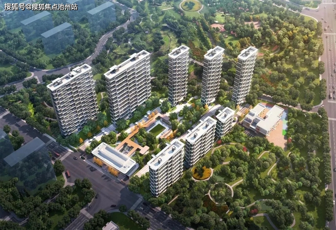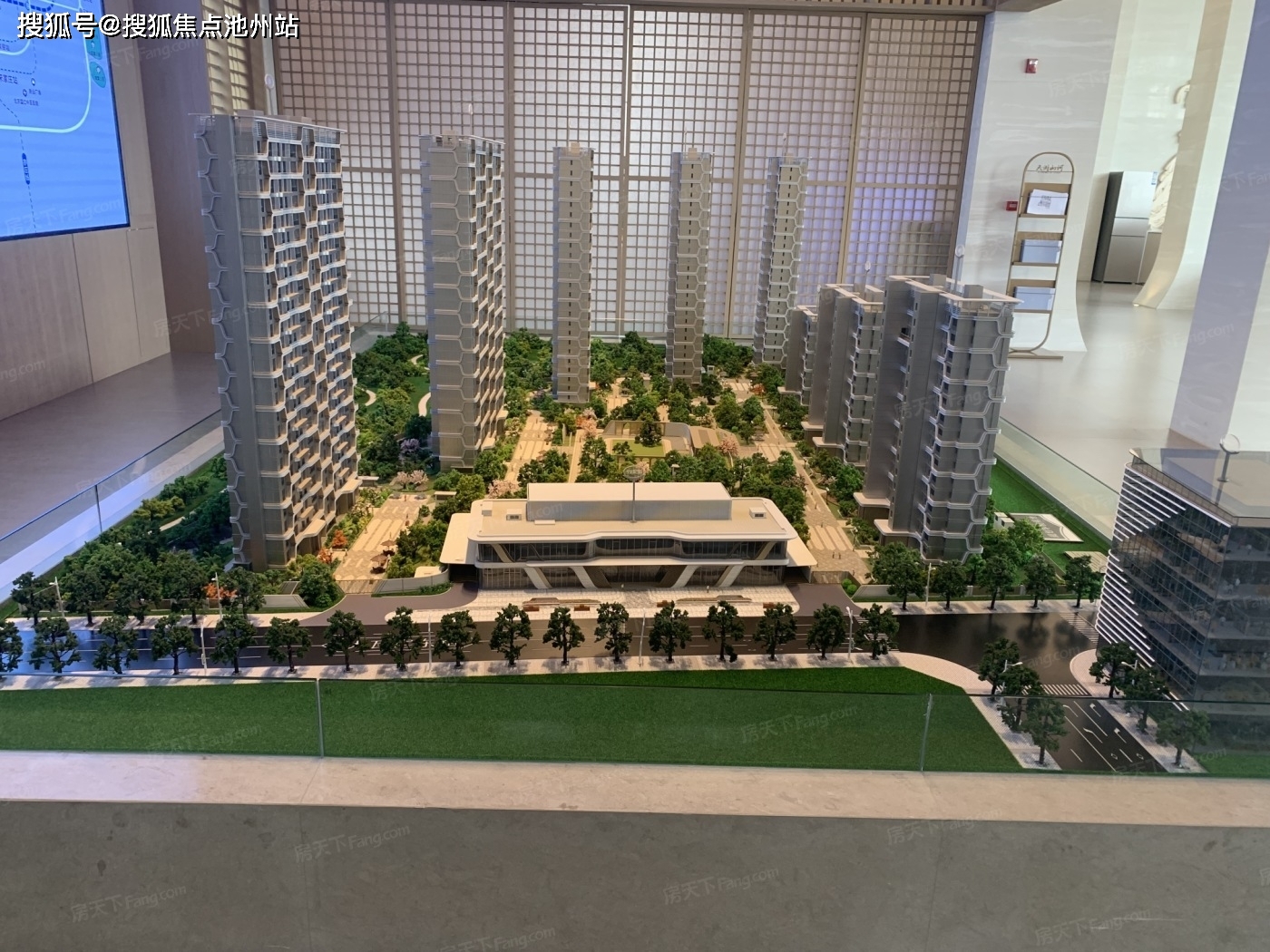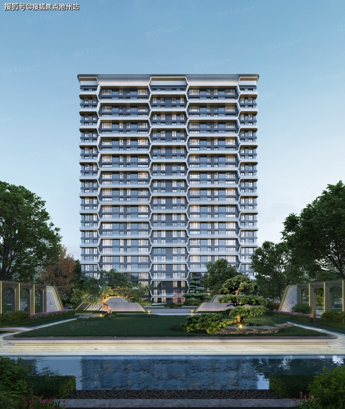 项目采用“新国潮”风格,在设计中汲取中国古建筑屋顶较高级别庑殿顶“中正平直”的特点,并革新性采用现代风格玻璃幕墙立面,将现代材质、简约风格与大屋顶符号优质相融,同时取粹中式古典园林师法造诣,提取颐和园式“一池三山”的风水布局,重构生活尺度。