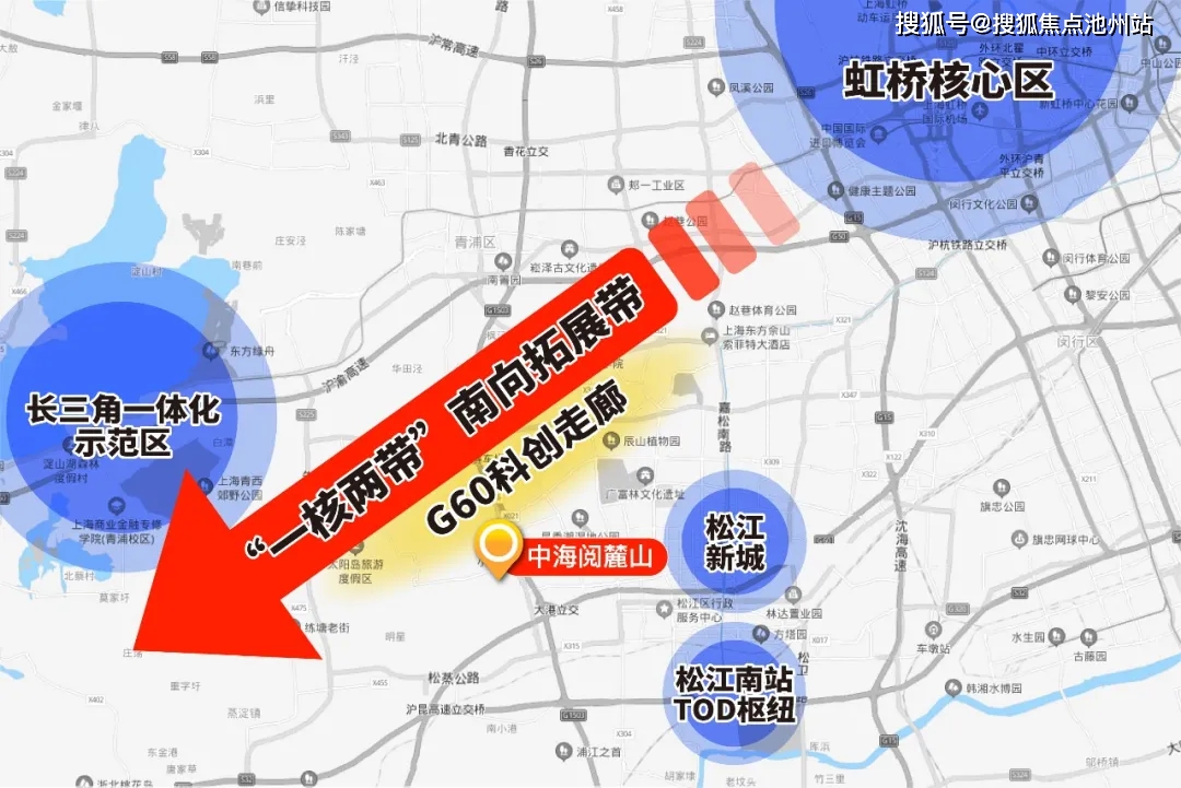中海阅麓山属于大虹桥“一核两带”的南向扩展带上,周边还有五大新城中的松江新城、G60科创走廊、长三角一体化示范区、松江南站TOD重量级规划环绕。