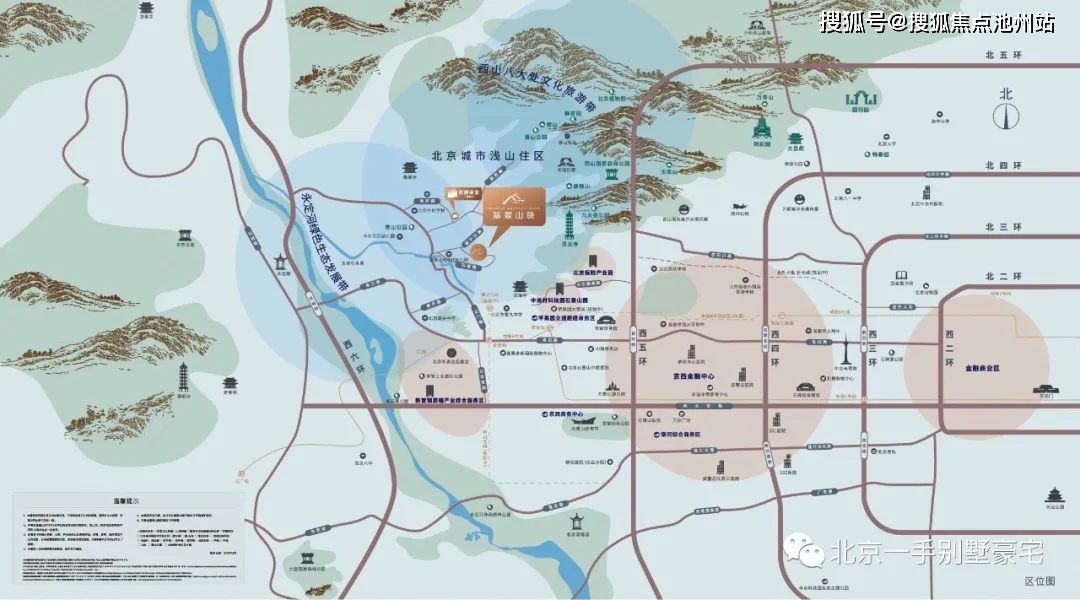 项目位于石景山西北部五里坨,地处著名的佛教圣地八大处的西侧,是浅山资源最为丰富的区域,自辽、金以来,北京西山就是风景优美的尊贵之地,皇家龙脉盘踞,现在也是军队大院的驻扎之地(象征权力)。无数的文人墨客流连于此,并留下传世名篇。翡翠山晓项目就位于这个上风上水的灵秀之地。同时处于“十三五”重点打造的西山八大处文化旅游发展带和永定河绿色生态发展带交汇处,翡翠山晓西有定都峰、北靠翠微山,与佛教圣地八大处法海寺、及皇家园林的三山五园一脉相承,南望永淀河北京的母亲河,形成了“三山环抱,一水环绕”之势。项目不但有宜居的生态环境,项目还坐拥三横四纵多轨道的立体交通网络。三横是阜石路、长安街、莲石路,四纵西四环、西五环、西六环和石门路。多轨道地铁有1号线、6号线、M11号、S1号线。