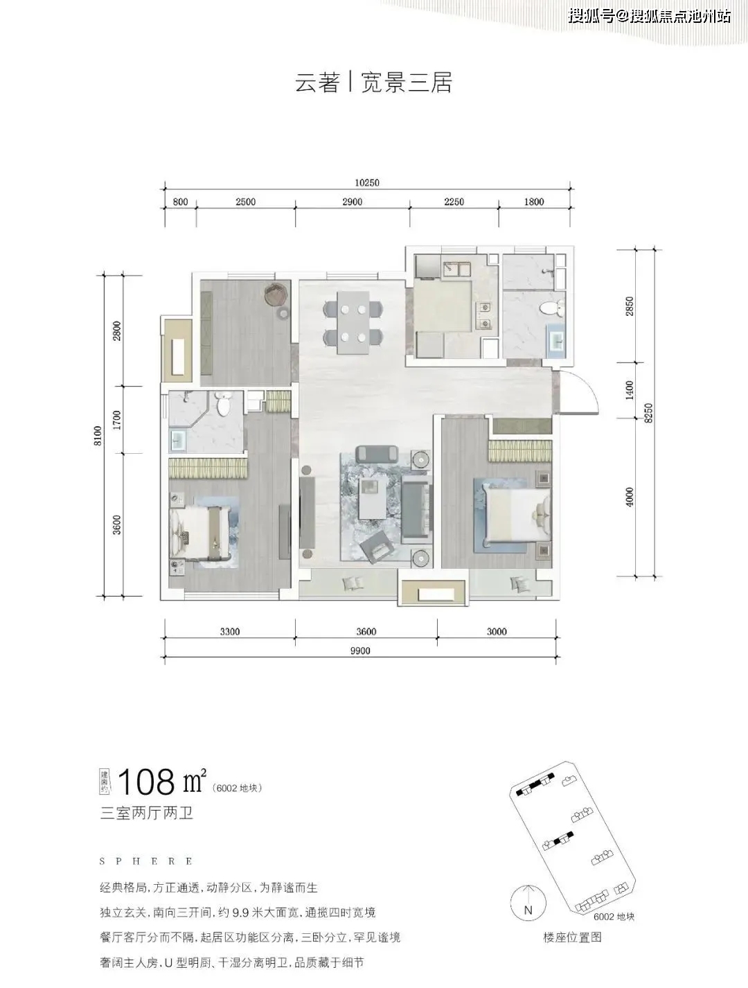 108㎡三室:南向三面宽约9.9米,北向面宽约10.25米,较大进深仅8.25米,全明格局,餐厅厨房自成一体,且餐厅有景观窗。